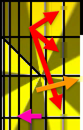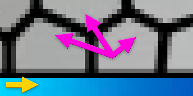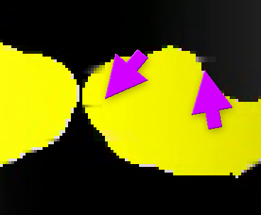 2) The red arrows and the orange arrow show smearing. The violet arrows in the pic below show other smears. This is due to postprocessing and is NOT encoded in the compressed material itself.