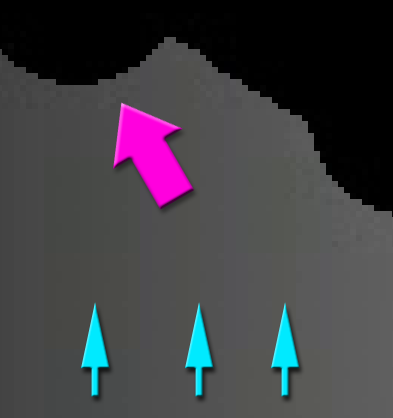 The purple arrow shows you again the JPG-like artefacts. The cyan arrows show you that DivX introduces color bands (where there was pure gray in the original).